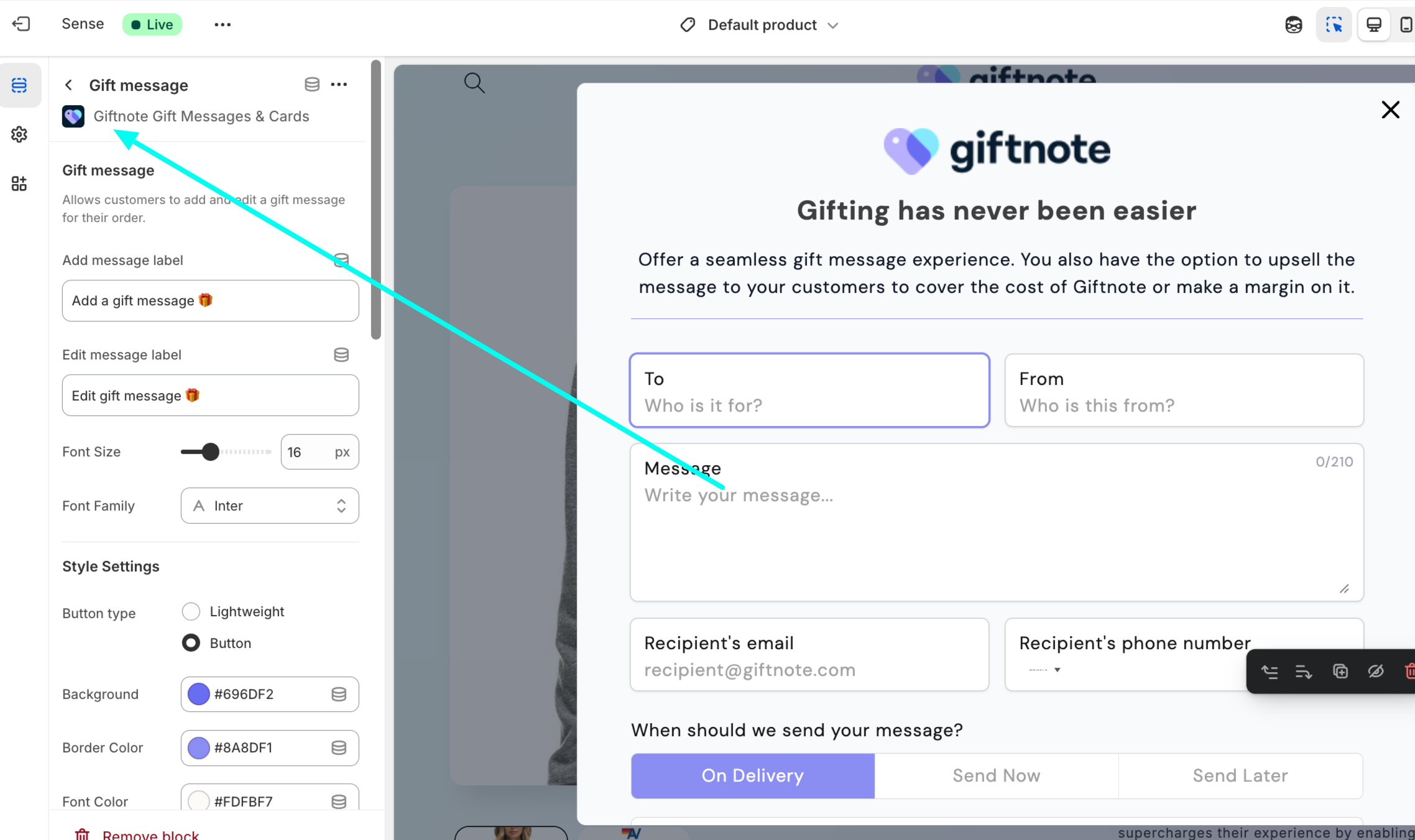 <template id="__NAME_OF_BUTTON__"> <style> /* ADD CSS HERE */ </style> </template> <giftnote-button data-styles="__NAME_OF_BUTTON__" data-add="Add a gift message" data-edit="Edit gift message" ></giftnote-button> Need help? Email support@giftnote.com